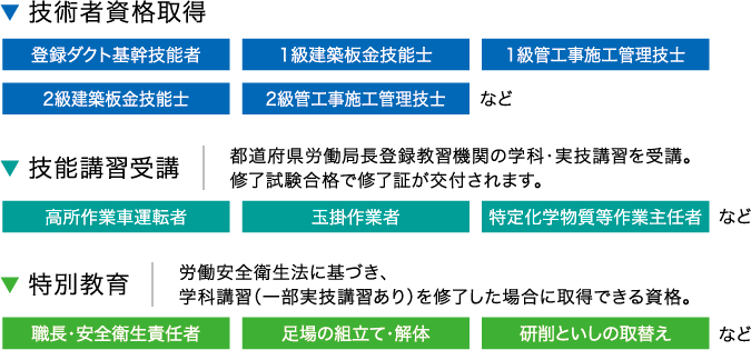 | 取得免許 | 登録ダクト基幹技能者 / 高所作業車運転者 1級建築板金技能士 / 玉掛作業者 1級管工事施工管理技士 / ガス溶接技能者 2級建築施工管理技士 / 雇用管理責任者 |